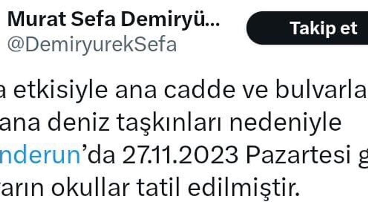 Kuvvetli sağanak yağış ve fırtına sonrası İskenderun Kaymakamı Murat Sefa Demiryürek sosyal medya hesabından yaptığı açıklamada, “Fırtına etkisiyle ana cadde ve bulvarlarda meydana gelen deniz taşkınları nedeniyle İskenderun ilçesinde 27.11.2023 Pazartesi günü okullar 1 gün tatil edildi” ifadelerini kullandı.