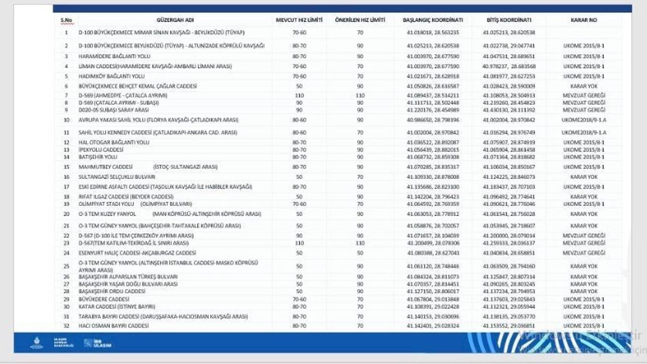 D100 Karayolu Büyükçekmece TÜYAP ile Altunizade Köprülü Kavşağı arasında saatte 80 kilometre olan hız limiti 90 kilometreye çıkarıldı. Beşiktaş Barbaros Bulvarı’nda maksimum hız limiti ise saatte 70 kilometre olarak değişirken, Hasdal-Okmeydanı Bağlantı Yolu’nun yeni hız limiti saatte 90 kilometre, O-3 TEM Ayrımı-Basın Ekspress Yolu’ndaki yeni limit saatte 100 kilometre olarak güncellendi. 4. Levent-TEM Bağlantı Yolu’nun yeni hız sınırı saatte 90 kilometre olurken, O3 Tem Ayrımı - Basın Ekspress yolu - (Mahmutbey Batı Kavşağı- Atatürk Havaalanı Kavşağı - Havaalanı Caddesi) saatte 110 kilometreye çıkarıldı. D100 Harem - Tuzla arası saatte 90 kilometreye, Söğütlüçeşme Köprülü Kavşağı - Uzunçayır Köprülü Kavşağı Arası saatte 90 kilometreye çıkarıldı. Bolluca - İhsaniye Yolu, Tantavi, Vecdi Diker ve Halit Ulukurt Tüneli ise saatte 90 kilometreye çıkarıldı. Kağıthane Anadolu Caddesi saatte 50 kilometreden 70 kilometre, Arnavutköy - Habipler Yolu (Sultangazi - Fenertepe Arası), Hal Otogar Bağlantı Yolu ve Haramidere Bağlantı yolu saatte 90 kilometre olarak güncellendi.
