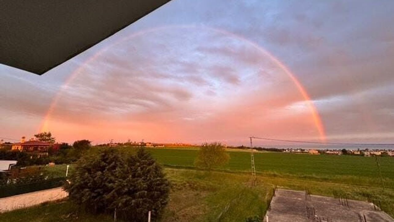 İstanbul Silivri’de yağışın ardından ortaya çıkan gökkuşağı günbatımı ile birleşince görsel şölenr sundu.