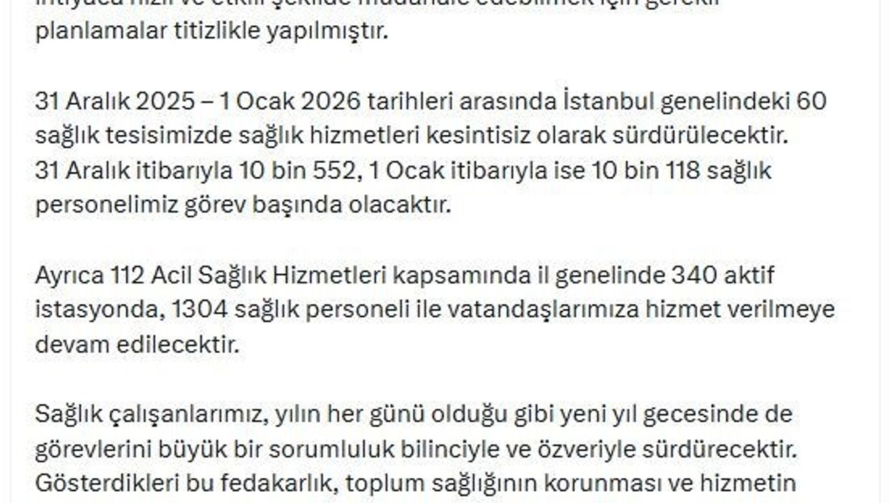 İstanbul İl Sağlık Müdürü Doç. Dr. Abdullah Emre Güner, sosyal medya hesabından yılbaşına ilişkin yaptığı açıklamada, 'Tüm hazırlıklarımızı tamamladık, 31 Aralık 2025-1 Ocak 2026 tarihleri arasında İstanbul genelindeki 60 sağlık tesisimizde sağlık hizmetleri kesintisiz olarak sürdürülecektir. 31 Aralık itibarıyla 10 bin 552, 1 Ocak itibarıyla ise 10 bin 118 sağlık personelimiz görev başında olacaktır' dedi.