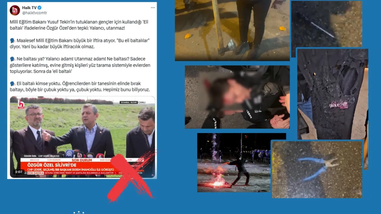 İletişim Başkanlığı, İstanbul Büyükşehir Belediyesi’ne yönelik yolsuzluk ve terör soruşturmasının ardından başlayan sokak olaylarıyla ilgili yayılan “Eli baltalı kimse yoktu. Öğrencilerden bir tanesinin elinde bırak baltayı, bir çubuk yoktu” iddiasının gerçeği yansıtmadığını açıkladı.ANKARA (İGFA) - Söz konusu dezenformasyonla ilişkin açıklama İletişim Başkanlığı'ndan geldi.
