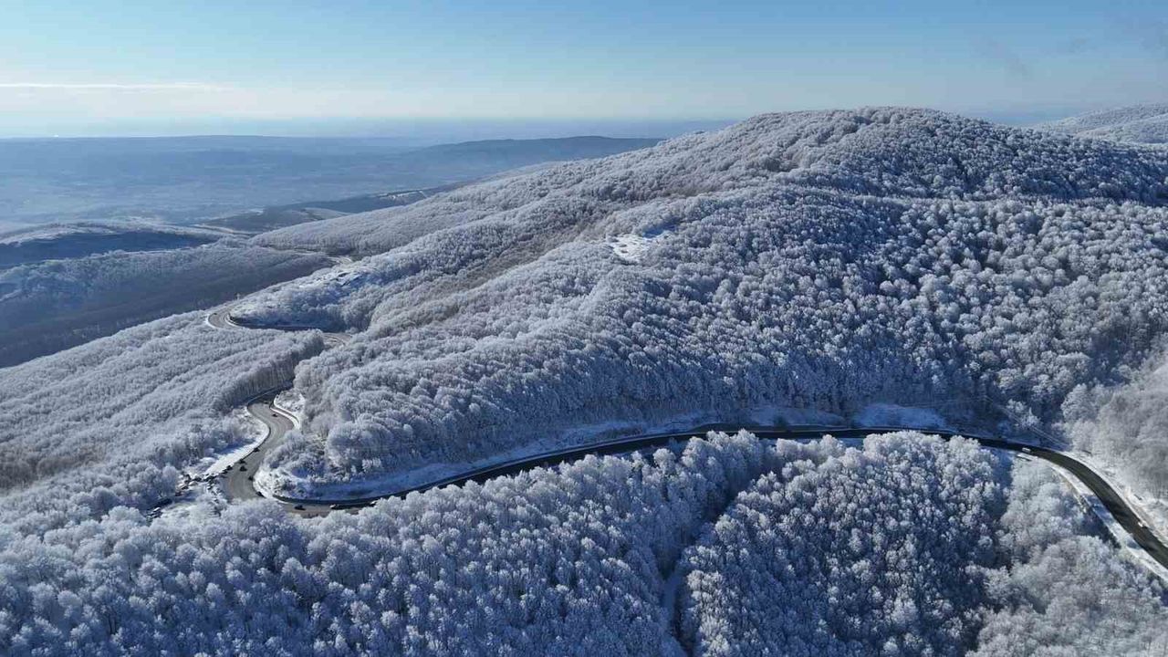 Kırklareli'nde Istranca Dağları'nın yüksek kesimleri, kar yağışı sonrası beyaz örtüyle kaplandı. Ağaçlar üzerinde oluşan kırağı, bölgenin doğal yapısını ortaya çıkardı.
