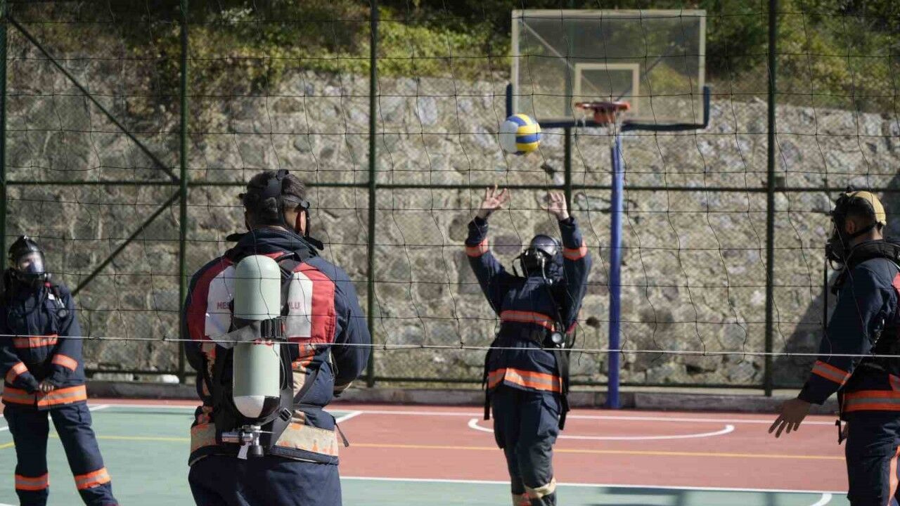 Gümüşhane’de itfaiyecilik programı öğrencileri, yangınlara hazırlık kapsamında 20 kilogramlık itfaiyeci kıyafetleriyle voleybol oynayarak hem eğleniyor hem de eğitim yapıyor.
