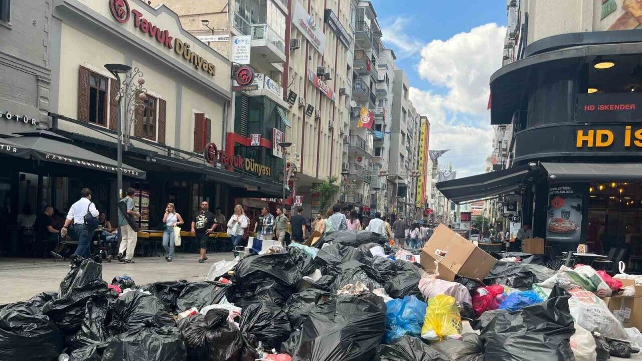 İzmir Büyükşehir Belediyesi’ne bağlı iştiraklerde çalışan işçilerin iş bırakma eylemi nedeniyle Alsancak, Kıbrıs Şehitleri Caddesi ve Kordon’da çöpler yollara taştı.