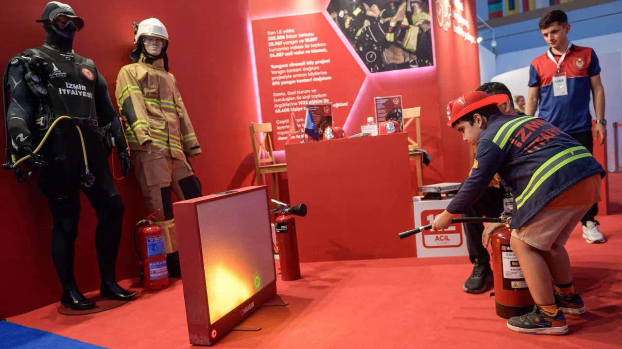 İEF’nin her yaştan konuğu, kuru kimyevi ve karbondioksitli yangın tüpleri ile doğru müdahale tekniklerini öğretmek üzere özel olarak hazırlanan senaryolarla, önemli bir deneyim yaşadı. Sanal gerçeklik gözlüğünü kullanan Kayra Çavuş, “Gözlüğü taktım, elime yangın tüpünü alarak yangın söndürdüm. Gerçeğe çok yakındı. Hatta bu eğitimi verenleri görmedim. Endişelendim. Dışarda daha önce böyle bir yangın görmedim. Burada görünce etkilendim” dedi.