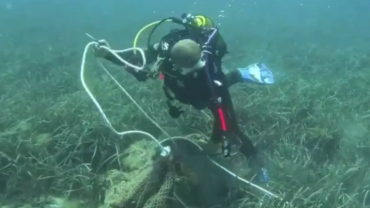 Deniz ekosistemine zarar veren terk edilmiş balık ağlarının toplandığı operasyonda, deniz dibinden 1,5 ton ağ çıkarıldı.