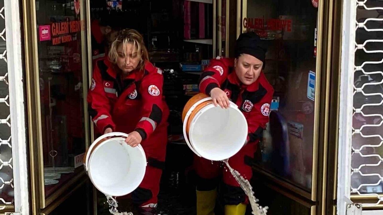 İzmir’de etkili olan yoğun yağışın ardından Kıbrıs Şehitleri Caddesi’ndeki esnaf, saatler sonra normale dönme çalışmalarına başladı.