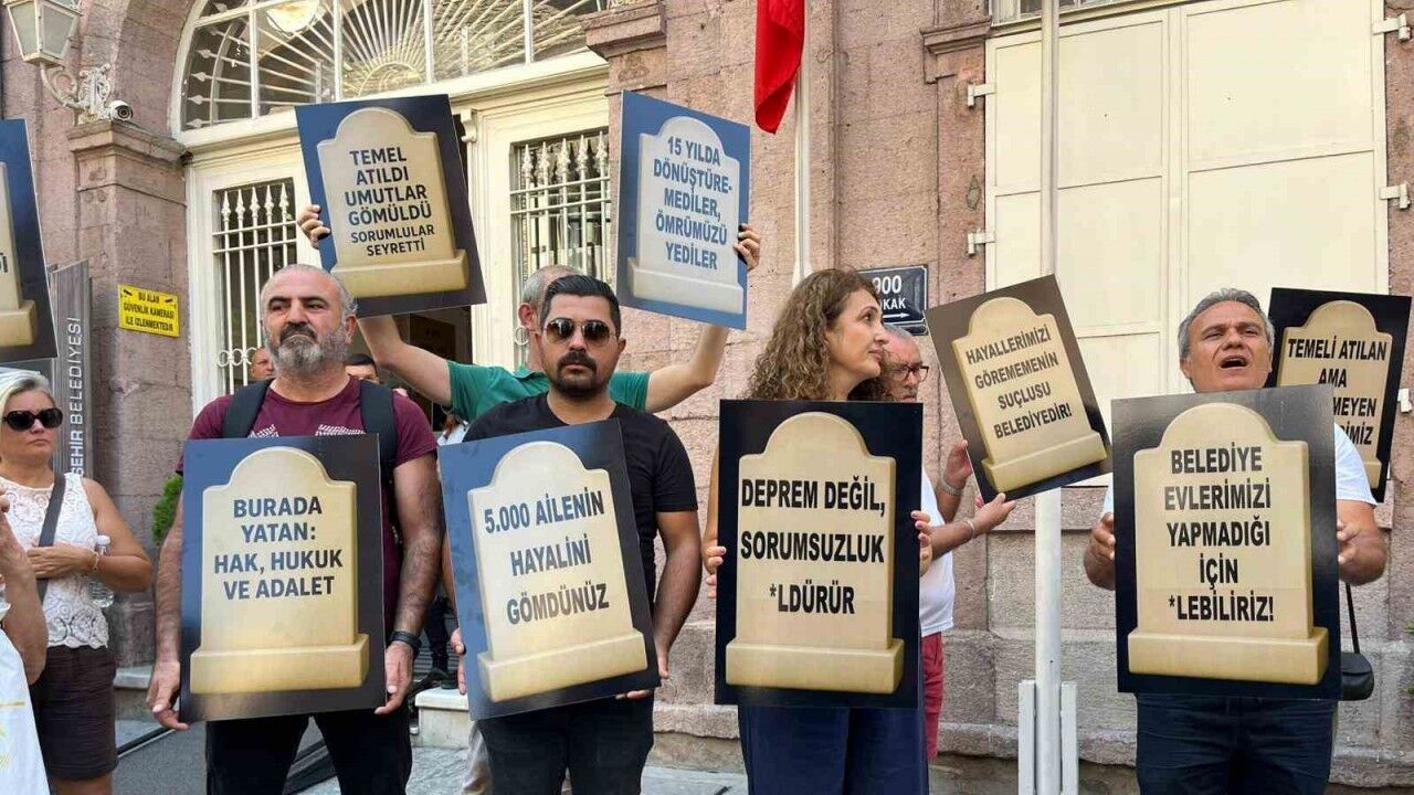 İzmir’de kentsel dönüşüm projelerindeki yolsuzluk ve yarım kalan inşaat iddiaları sebebiyle mağdur olan kooperatif üyeleri, Büyükşehir Belediyesi önünde yaptıkları eylemde, meydana gelebilecek bir depremde yaşanacak can kayıplarından belediye başkanını sorumlu tuttuklarını açıkladı. Mağdurlar, mezar taşı şeklindeki afişleri de belediye binası önüne bıraktı.