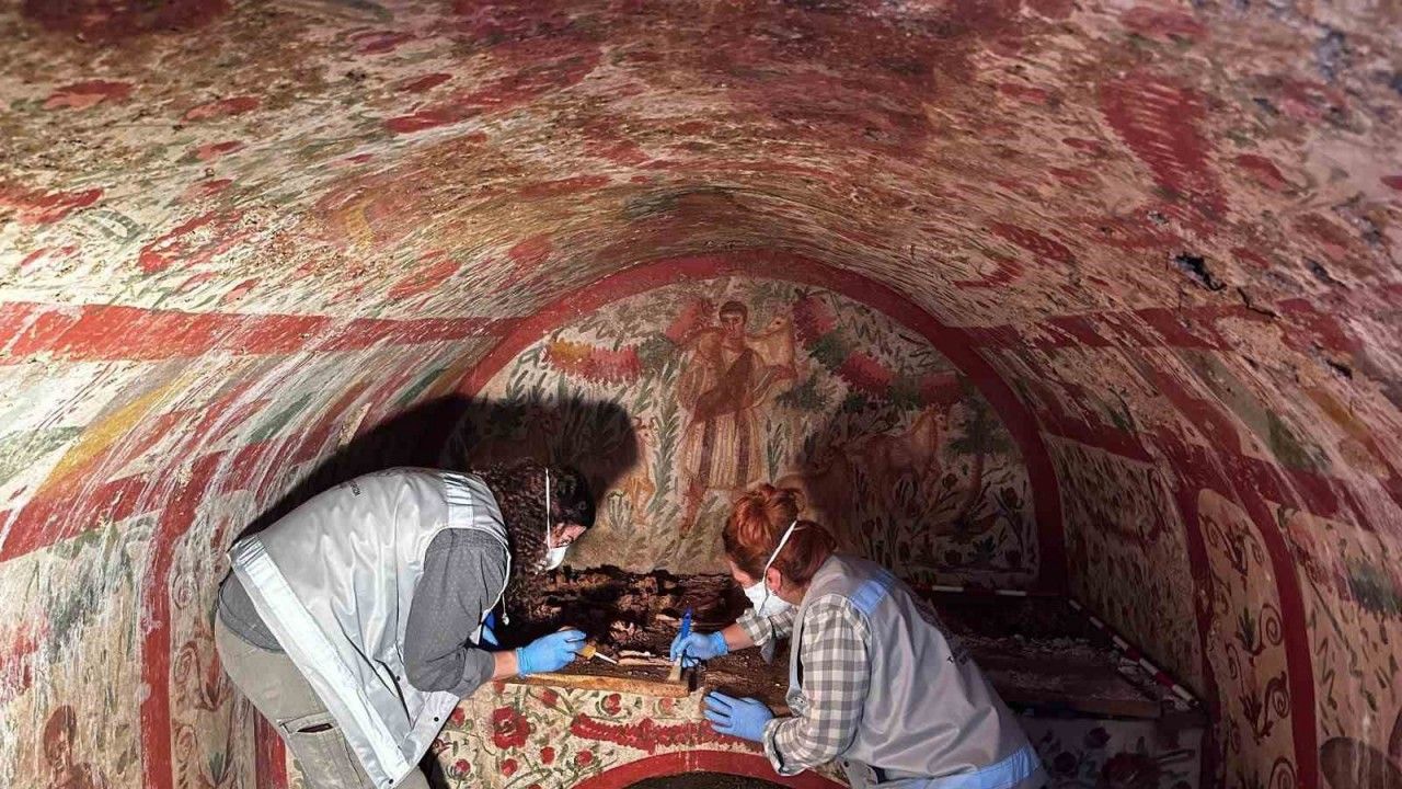 Mezarın kuzey duvarına bitişik klinein pişmiş toprak kare levhalarla kaplı olduğu, ölülerin bu levhaların üzerine yatırıldığı belirlendi. Klinein ardındaki kuzey duvarında ise nadir görülen ’Çoban İsa’ figürü dikkat çekti.