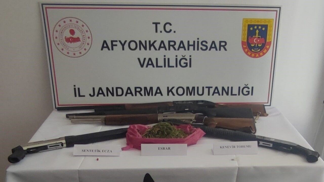 Olay, Şuhut ilçesinde meydana geldi. Edinilen bilgilere göre, Afyonkarahisar İl Jandarma Komutanlığı Kaçakçılık ve Organize Suçlarla Mücadele Şube Müdürlüğü ve Şuhut İlçe Jandarma Komutanlığı ekipleri ilçede yaşayan S.K.’nın esrar bulundurduğu ve satışını yaptığı yönünde istihbarı bilgi elde etti. Bunun üzerine şahsın evine baskın düzenleyen ekipler yaptıkları aramada 155 gram esrar, 1 adet sentetik ecza (uyuşturucu hap), 1 gram kenevir tohumu ve 2 adet yivsiz av tüfeği ele geçirdi. Olayın ardından S.K., gözaltına alınırken, şüpheliye ayrıca iki av tüfeği için 5 bin 728 TL idari para cezası kesildi.