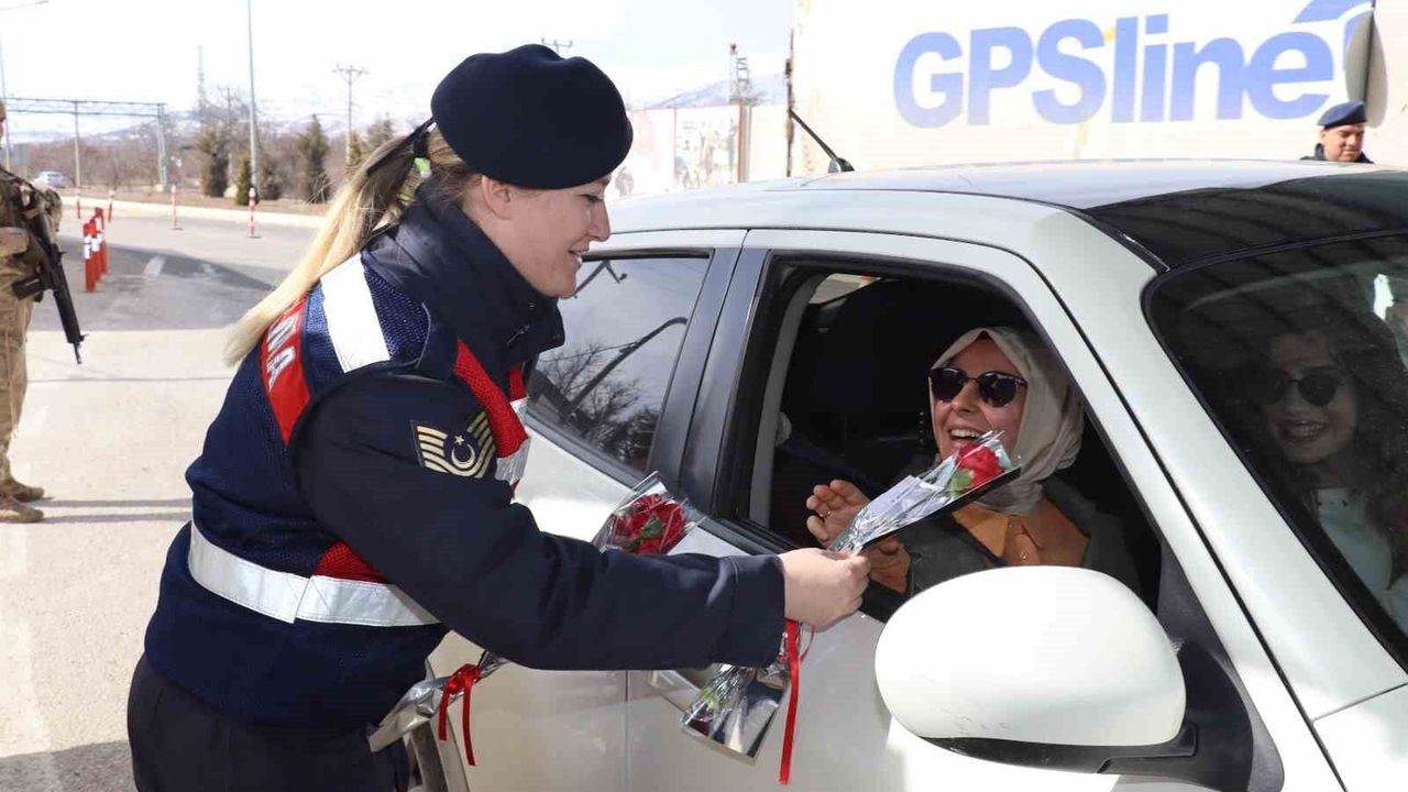 Elazığ'da İl Jandarma Komutanlığı ekipleri tarafından 8 Mart Dünya Kadınlar günü dolayısıyla, trafikte araç kullanan kadın sürücü ve yolculara karanfil hediye edildi.