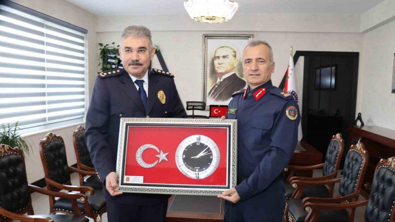 İl Jandarma Komutanı Tuğgeneral Ercan Atasoy ve beraberindeki jandarma personeli, Türk Polis Teşkilatı’nın 180’inci kuruluş yıl dönümü dolasıyla İl Emniyet Müdürü Kamil Karabörk’ü ziyaret etti.