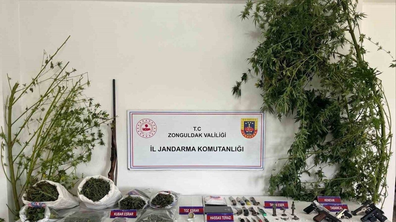 Belirlenen 6 adrese eş zamanlı olarak yapılan aramalarda; 2 kilo 864 gram kubar esrar, 16 gram toz esrar, 2 kök kenevir bitkisi, 1 adet hassas terazi ve 96 adet kilitli poşet ele geçirildi. Operasyonda ayrıca 5 adet kurusıkı tabanca, 1 adet av tüfeği, tarihi eser niteliğinde olduğu değerlendirilen 5 obje, 1 adet sikke ile 12 adet bıçak ve kama bulundu.