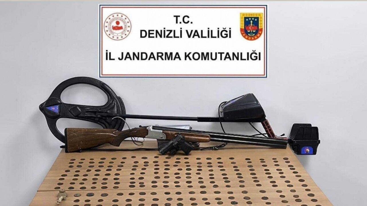 Denizli’de kültür ve tabiat varlığı kaçakçılığı yapan şüpheli şahsa yönelik jandarma ekipleri tarafından düzenlenen operasyonda Roma dönemine ait sikke, yüzük, kolye, hayvan heykeli gibi çok sayıda tarihi eser ve silah ele geçirildi.