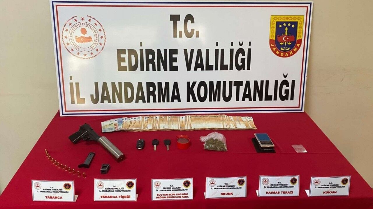 Edirne İl Jandarma Komutanlığı ekipleri, uyuşturucuyla mücadele çalışmalarını aralıksız olarak sürdürüyor. Jandarma ekipleri, çalışmalar çerçevesinde şüphe üzerine bir otomobili durdurarak arama yaptı. Yapılan arama sonucu tabanca ve 13 fişek, susturucu, alev gizleyen, 11 gram skunk, uyuşturucu öğütme aparatı, hassas terazi ve uyuşturucu ticaretinden elde edildiği değerlendirilen 8 bin 535 euro ele geçirildi. Yakalanan sürücü gözaltına alındı.