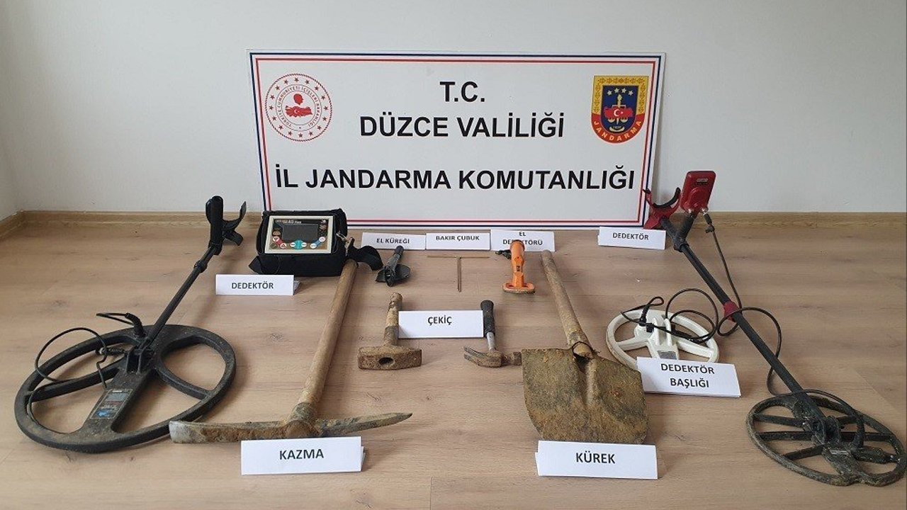 Düzce İl Jandarma Komutanlığı'na bağlı Cumayeri İlçe Jandarma Komutanlığı ekipleri devriye sırasında ormanlık alanda hareketlilik olduğunu fark etti. Alanda yapılan incelemede kaçak kazı yapan 3 kişi ile birlikte 3 adet dedektör, 2 adet kürek, 1 adet kazma, 2 adet bakır çubuk, 2 adet çekiç, 3 adet şarj aleti ele geçirildi.