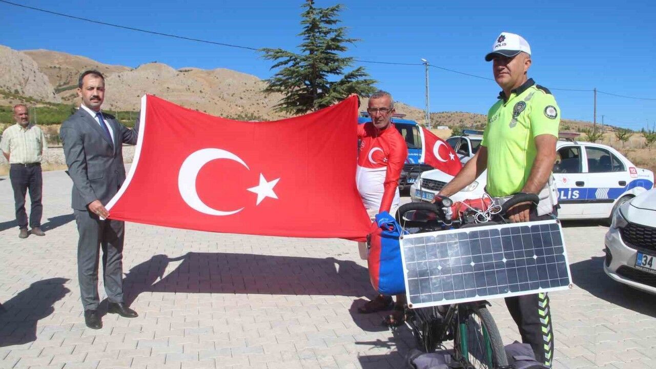 Şehitler anısına çıktığı bisiklet turlarıyla bilinen Orhan Kotluk, İzmir Adliyesi’nden teslim aldığı Türk bayrağını şehit polis memuru Fethi Sekin’in memleketi Elazığ’ın Baskil ilçesine getirdi.
