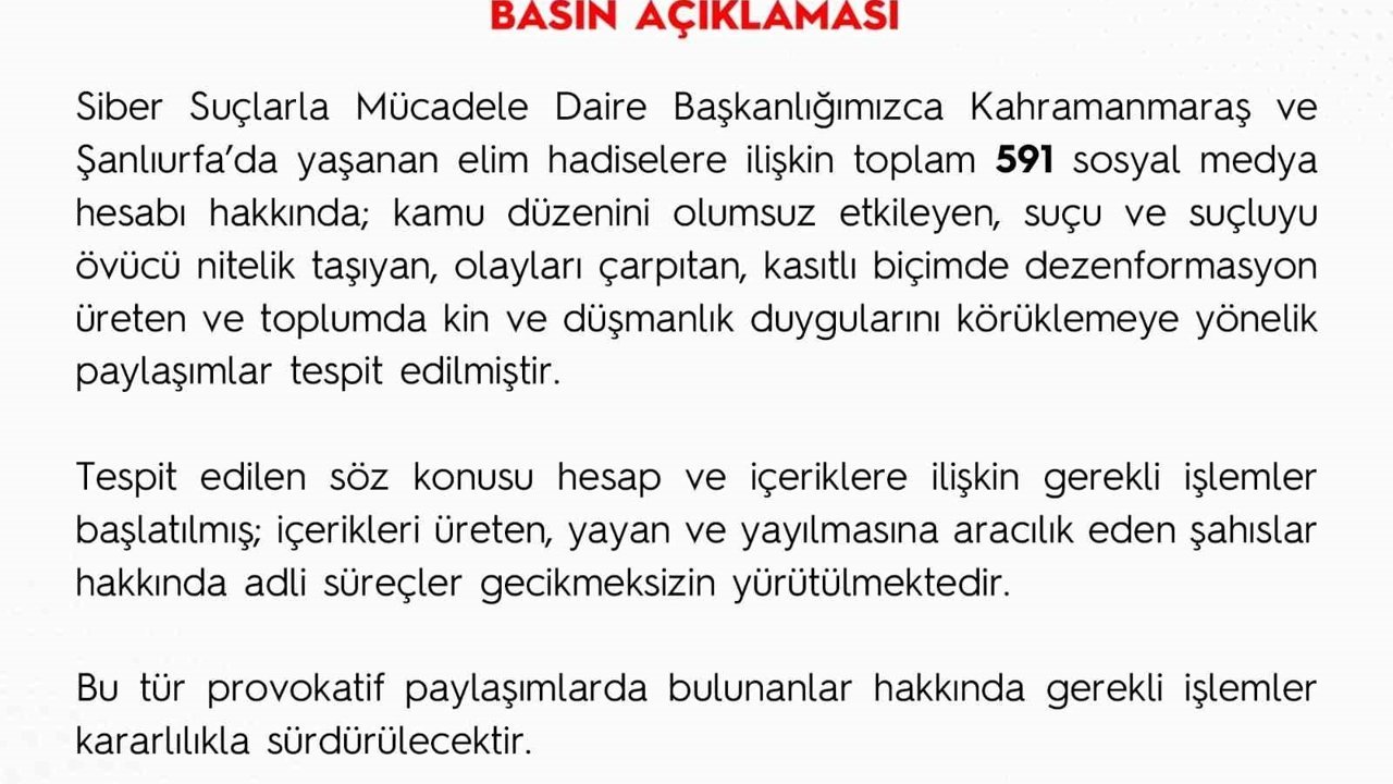 Emniyet Genel Müdürlüğü (EGM) tarafından yapılan açıklamada, 'Siber Suçlarla Mücadele Daire Başkanlığımızca Kahramanmaraş Şanlıurfa'da yaşanan elim hadiselere ilişkin toplam 591 sosyal medya hesabı hakkında; kamu düzenini olumsuz etkileyen, suçu ve suçluyu övücü nitelik taşıyan, olayları çarpıtan, kasıtlı biçimde dezenformasyon üreten ve toplumda kin ve düşmanlık duygularını körüklemeye yönelik paylaşımlar tespit edilmiştir. Tespit edilen söz konusu hesap ve içeriklere ilişkin gerekli işlemler başlatılmış; içerikleri üreten, yayan ve yayılmasına aracılık eden şahıslar hakkında adli süreçler gecikmeksizin yürütülmektedir. Bu tür provokatif paylaşımlarda bulunanlar hakkında gerekli işlemler kararlılıkla sürdürülecektir' ifadelerine yer verildi.
