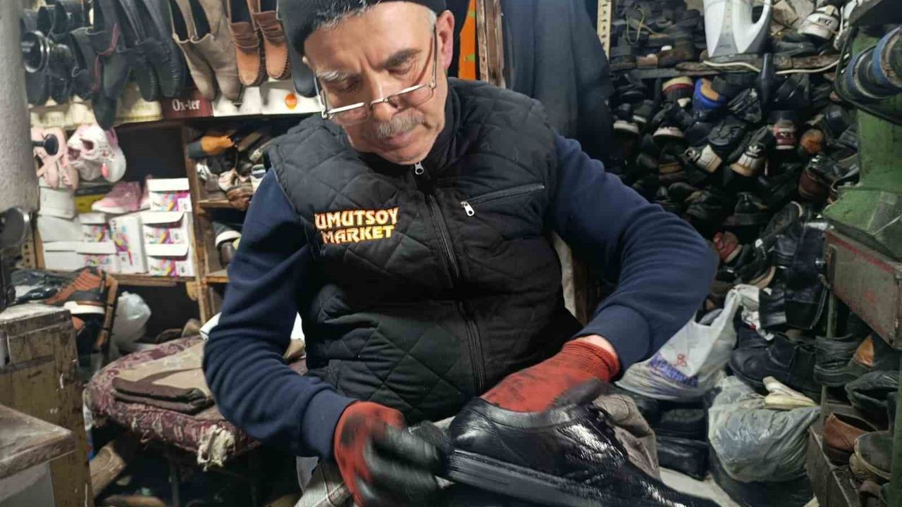 Kahramanmaraş'ın Onikişubat ilçesinde ayakkabı tamirciliği yapan Bayram Bayır, vatandaşların atmaya kıyamadığı eski ve sökük ayakkabıları yenileyerek uzun yıllar kullanılmasını sağlıyor.