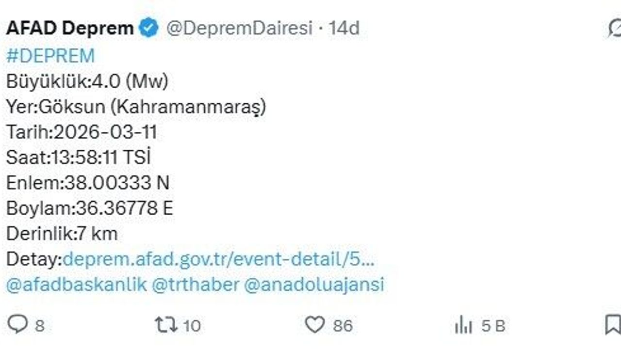 Afet ve Acil Durum Yönetimi Başkanlığı'ndan (AFAD) alınan bilgilere göre, Kahramanmaraş'ın Göksun ilçesinde saat 13.58'de 4 büyüklüğünde deprem meydana geldi. Depremin derinliği 7 kilometre olarak ölçüldü.
