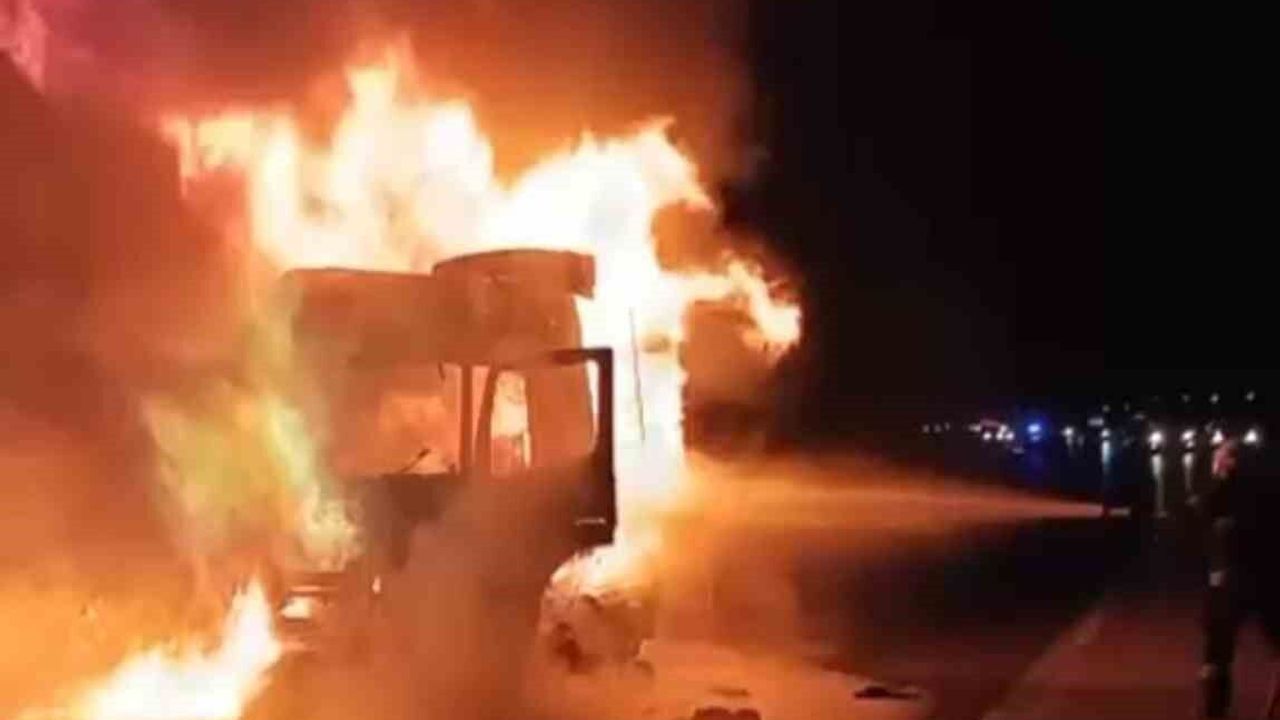 Kahramanmaraş’ta seyir halindeki tır, alev alev yanarak kullanılamaz hale geldi.