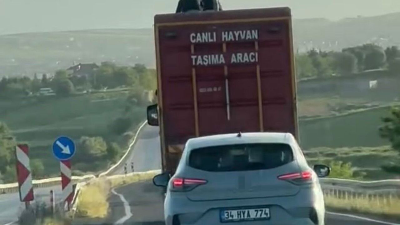 Elazığ-Bingöl karayolunda canlı hayvan taşıyan kamyonun üzerinde 3 kişinin tehlikeli yolculuğu kameralara yansıdı.