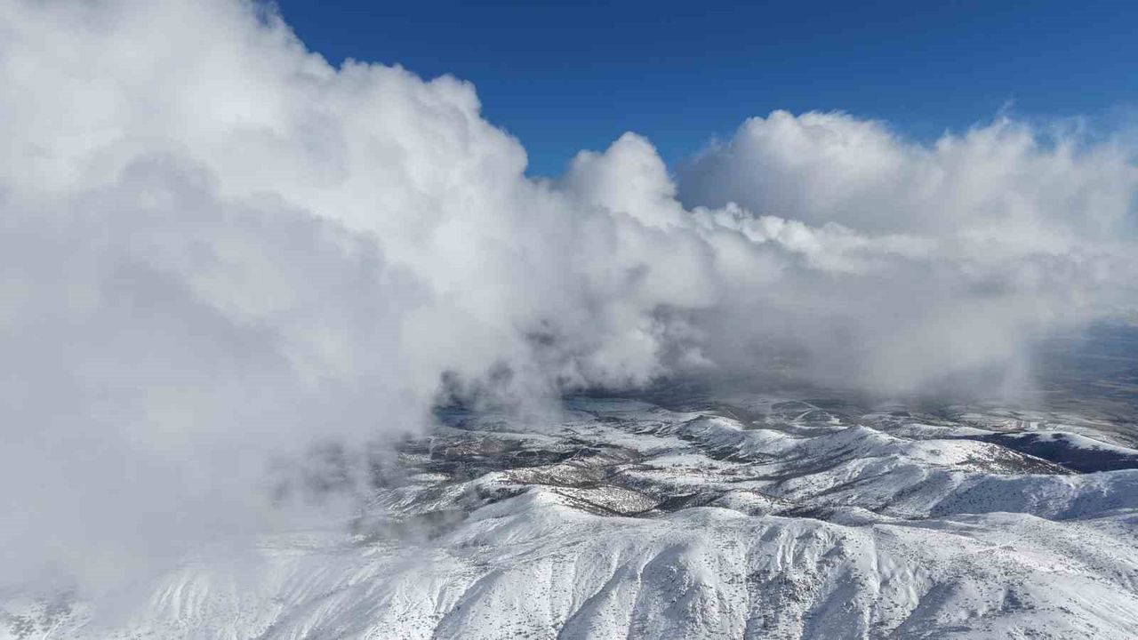 Soğuk havanın etkili olduğu Dinek Dağı'nda, karla kaplanan zirve ve yoğun bulutlar havadan görüntülendi. Beyaza bürünen dağ silueti, bulutların arasından yükselen manzarasıyla görsel şölen sundu. Yüksek kesimlerde kışın tüm güzelliğini yansıtan doğa, havadan çekilen görüntülerle gözler önüne serildi.