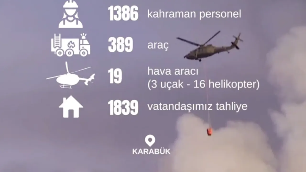 Yangınla mücadelede bin 386 personelin, 389 araç ve 3 uçak ile 16 helikopterden oluşan 19 hava aracıyla yoğun bir çaba sarf edildiğini ifade eden Bakan Yerlikaya, “Karabük’te ormanlarımız için, canlarımız için, vatan toprağımız için yangınlara karşı mücadelemizi aralıksız sürdürüyoruz” dedi.
