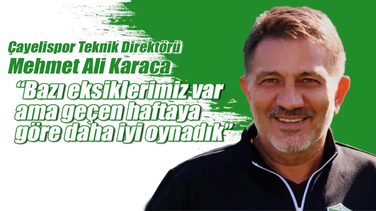 Alınan kötü sonuçların ardından teknik direktör Özgür Göynü ile yolların ayrılmasının ardından Çayelispor’da göreve gelen Mehmet Ali Karaca, takımın her geçen gün daha iyi olduğunun altını çizdi. Tecrübeli hoca ön bölgede daha etkili olabilmek için çalışmalara devam ettiklerini söyledi. Karşılaşmanın son 15 dakikalık kısmında maçı kazanabileceklerini belirten Karaca: “Zorlu bir rakibe karşı mücadele ettik. Mücadele olarak oyuncularımız iyi bir performans sergilediler. Ama yine geçen haftaki müsabaka gibi geçişlerde yine çok yeterli olamadık. Son 15 dakika rakibimiz bizden daha üstün bir oyun sergiledi. Ancak yine son 15 dakikada oyunu biz alabilirdik. İki tane topumuz direkten döndü. Ama dediğim gibi böyle dengeli bir oyun oynamaya çalıştık.