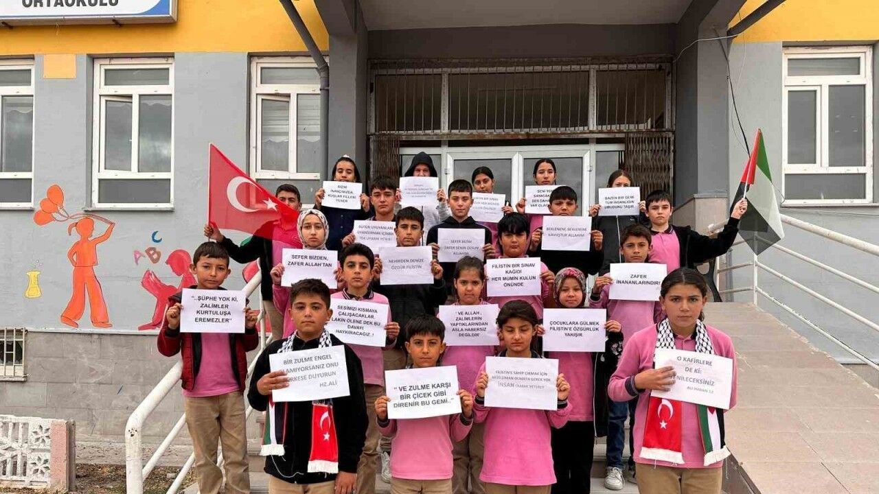 Konya’nın Karapınar ilçesinde ilk ve ortaokul öğrencileri, Filistin’de yaşanan insan hakları ihlallerine dikkat çekmek ve duyarlılık oluşturmak amacıyla farkındalık etkinliği düzenledi.