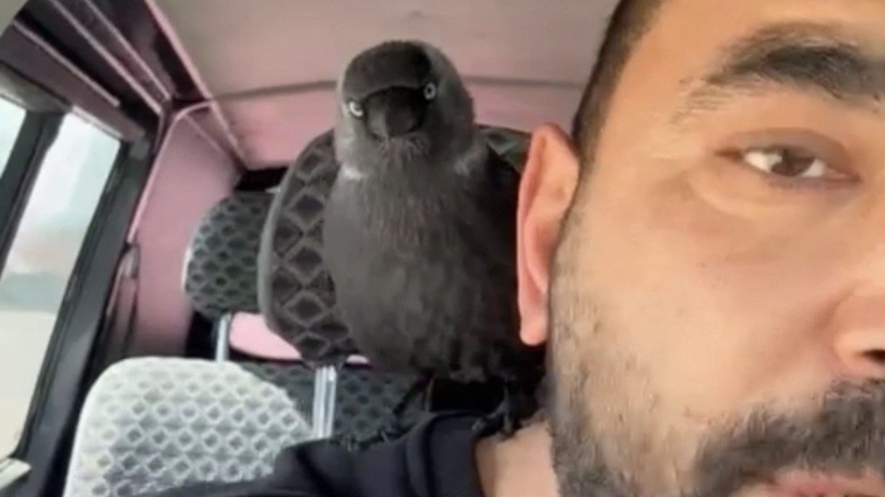 Düzce'de seyir halindeki otomobilin sileceğine, ardından da açık camdan içeri süzülerek sürücünün omzuna konan karganın yolculuğu renkli görüntülere sahne oldu. Şaşırtıcı anlar cep telefonu kamerasıyla saniye saniye kaydedildi.