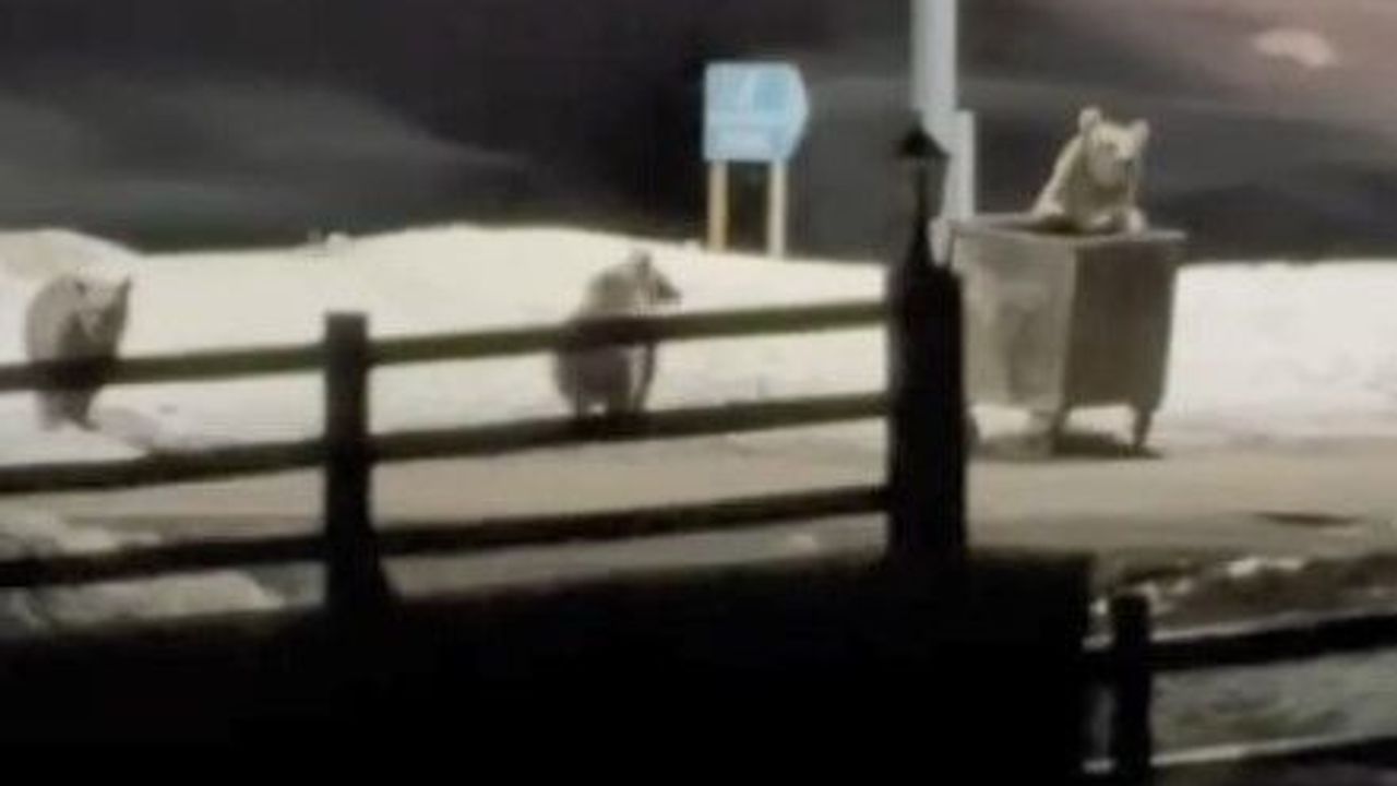 Kars'ın Sarıkamış ilçesinde kış uykusundan uyanan anne ayı ve iki yavrusu, yiyecek aramak için yerleşim alanına indi. Ayı ailesinin çöp konteynırlarında yiyecek aradığı anlar cep telefonu kamerasına yansıdı.