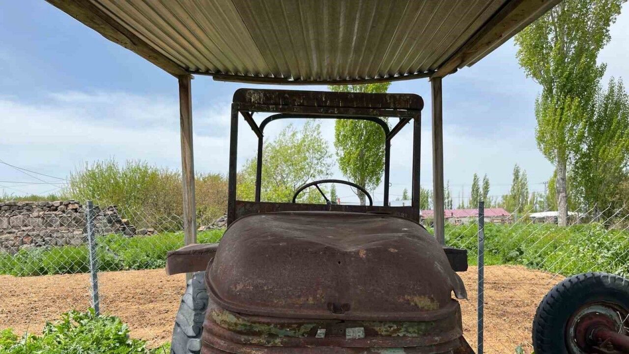 Akyaka’da bir vatandaş babasının 1952 yılında kullandığı traktörü, hatıra olarak evinin bahçesinde saklıyor. Yarım asırlık traktör, bölgede tarımda kullanılan ilk traktör.