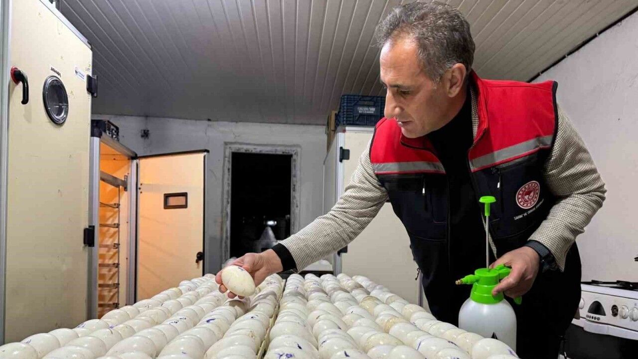 Macaristan’dan getirilen kaz yumurtaları Tarım ve Orman Müdürü Enver Aydın’ın katılımlarıyla kuluçka makinelerine yerleştirmeden önce bir dizi teste tabi tutuldu.