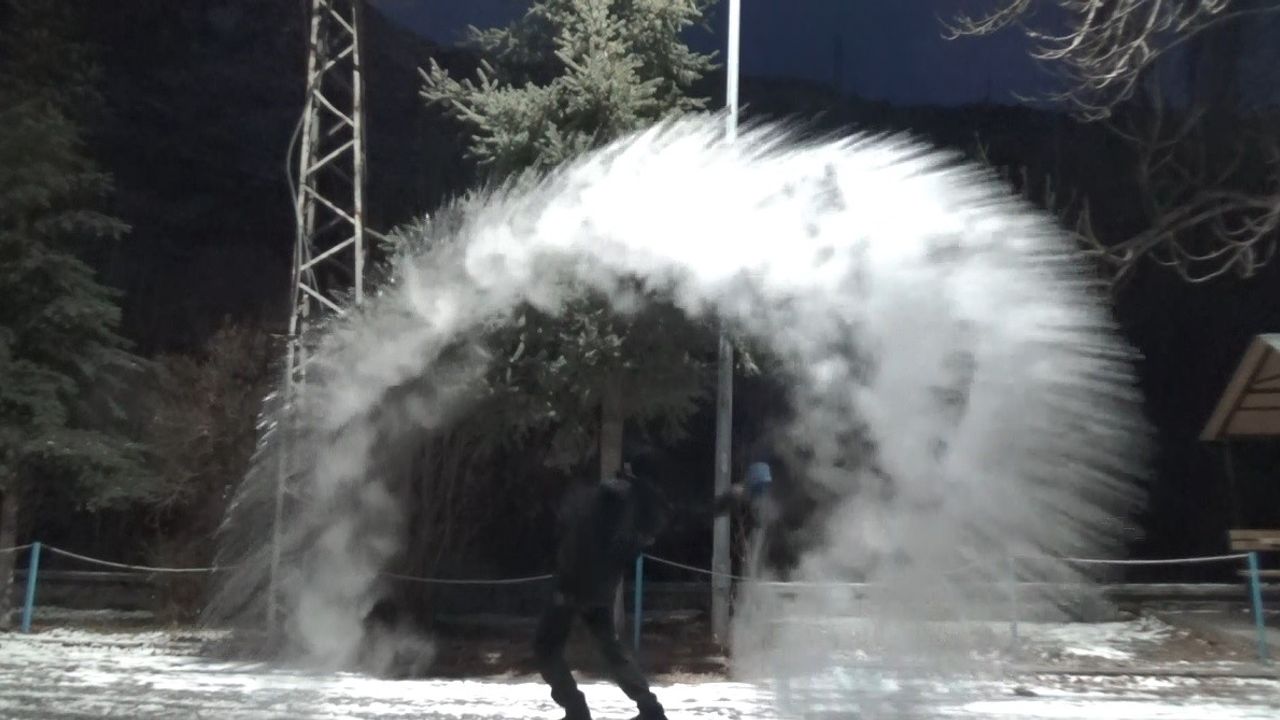 Öte yandan, kentte bir vatandaşın havaya serptiği sıcak su soğuğun etkisiyle dondu. O anlar ise kameraya yansıdı.