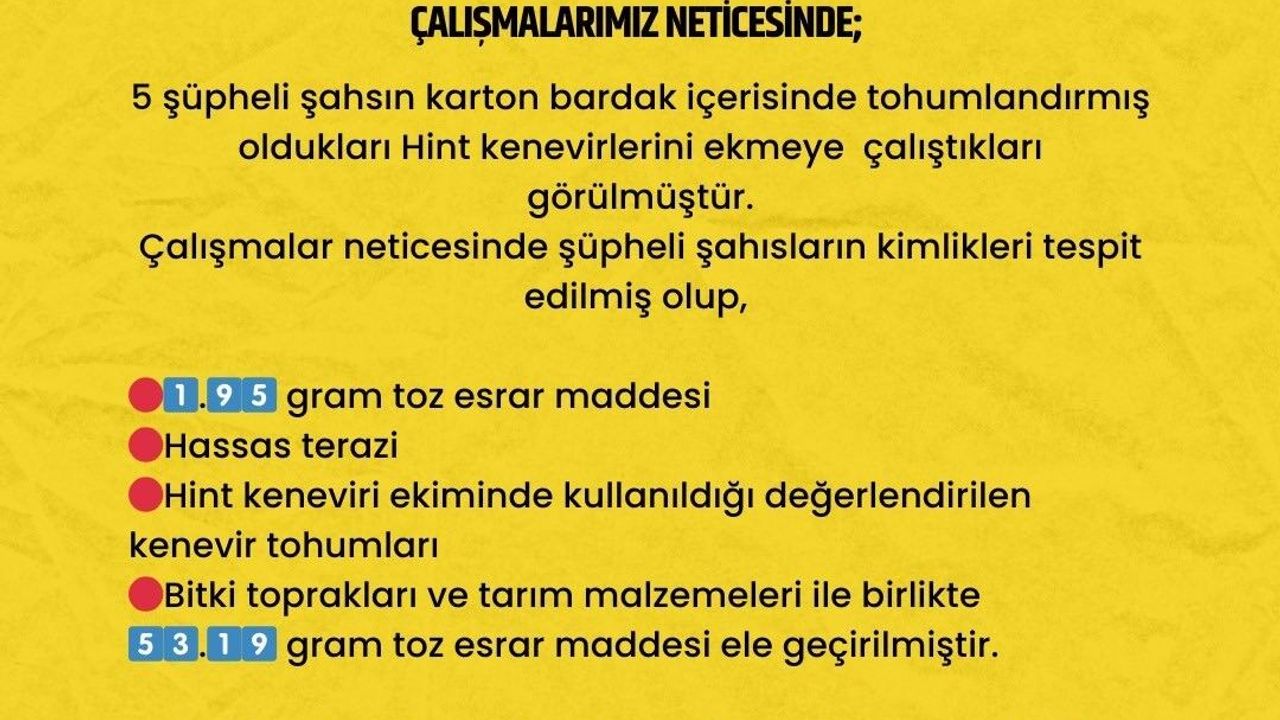 Bingöl Emniyet Müdürlüğü Narkotik Suçlarla Mücadele Şube Müdürlüğü Genç Büro Amirliğince uyuşturucu veya uyarıcı madde ticareti ve kullanımını engellemek amacıyla çalışma gerçekleştirdi. Çalışmalar neticesinde 5 şüpheli şahsın karton bardak içerisinde tohumlandırılmış oldukları Hint kenevirlerini ekmeye çalıştıkları belirlendi. Çalışmalar neticesinde şahısların kimlikleri tespit edildi. Operasyonda 1.95 gram toz esrar, hassas terazi, Hint keneviri ekiminde kullandıkları değerlendirilen kenevir tohumları, bitki toprakları ve tarım malzemeleri ile 53.19 gram toz esrar maddesi ele geçirildi. Yakalanan 5 şüpheli hakkında adli işlemlere başlandığı belirtildi.