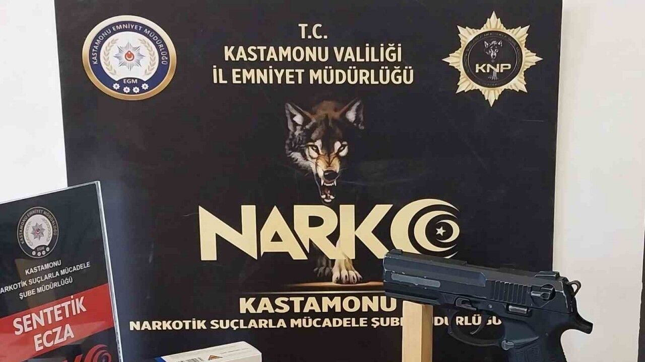 Edinilen bilgiye göre, Kastamonu İl Emniyet Müdürlüğü Narkotik Suçlarla Mücadele Şube Müdürlüğü ekiplerince yapılan çalışmalar neticesinde, tespiti yapılan bir ikamette arama yapıldı. Aramada 1 adet 1 adet ruhsatsız tabanca, 1,99 gram sentetik ecza tozu ile sentetik ecza hapları ele geçirildi.