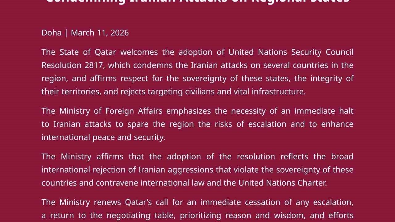 Katar Dışişleri Bakanlığı'ndan yapılan açıklamada, Birleşmiş Milletler Güvenlik Konseyi'nin İran'ın bölge ülkelerine yönelik saldırılarını kınayan bir karar tasarısını kabul etmesinin memnuniyetle karşılandığı belirtilerek, taraflara müzakere masasına geri dönme çağrısında bulunuldu.