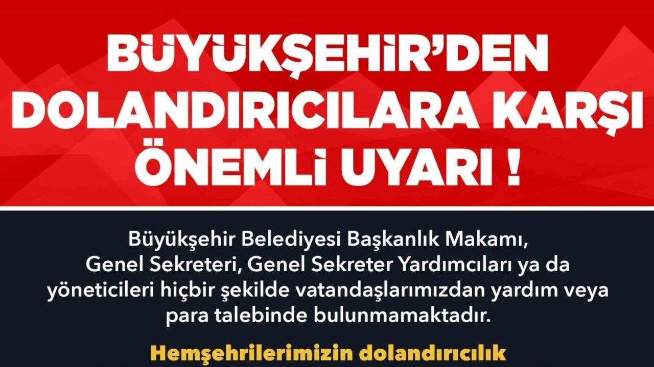 Büyükşehir Belediyesi, son günlerde art niyetli kişilerin belediye adıyla ya da bazı belediye bürokratlarının ismini kullanarak vatandaşlardan para talep ettiği yönünde şikâyetlerin artması üzerine bir uyarı yayınladı.