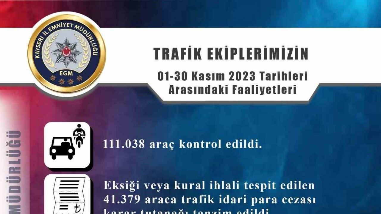 Kayseri l Emniyet Müdürlüğü Trafik Ekipleri tarafından 01-30 Kasım tarihleri arasında yapılan çalışmalarda 111 bin 38 araç kontrol edildi. Çalışmalarda eksiği veya kural ihlali tespit edilen 41 bin 379 araca trafik idari para cezası karar tutanağı tanzim edildi.