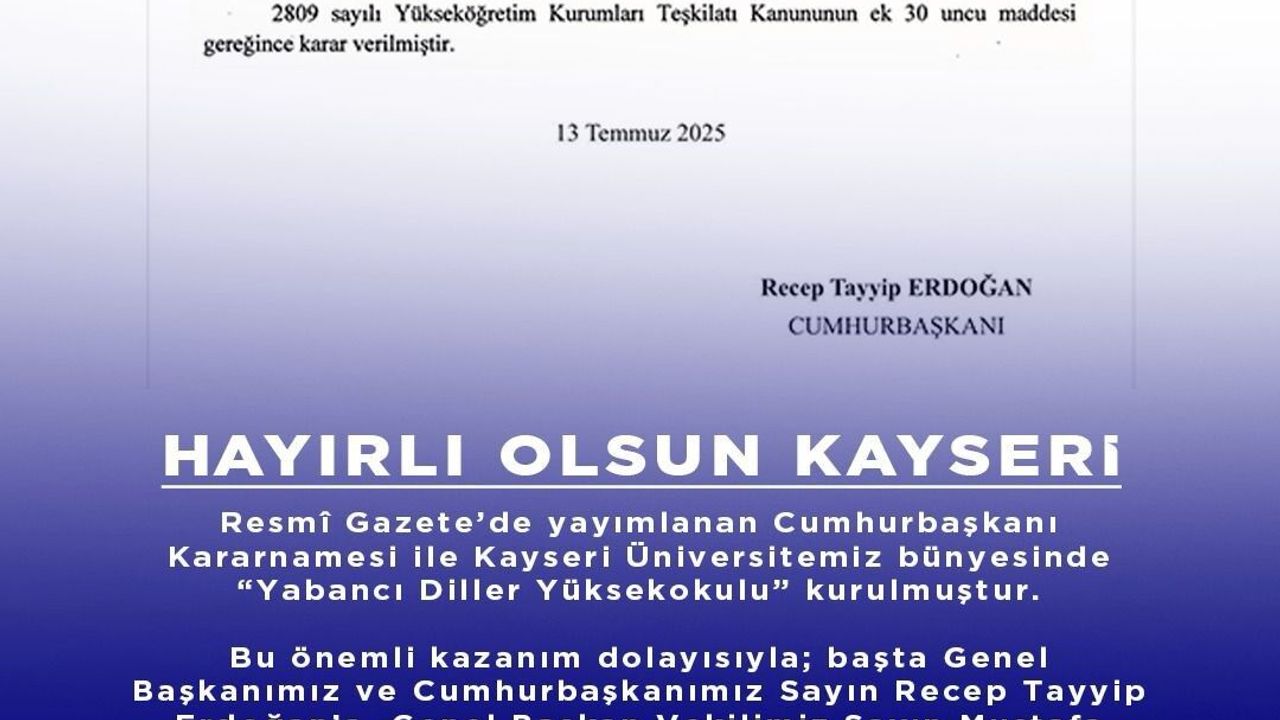 Başkan Okandan yaptığı paylaşımda; "Resmî Gazete’de yayımlanan Cumhurbaşkanı Kararnamesi ile Kayseri Üniversitemiz bünyesinde ’Yabancı Diller Yüksekokulu’ kurulmuştur. Bu önemli kazanım dolayısıyla; başta Genel Başkanımız ve Cumhurbaşkanımız Sayın Recep Tayyip Erdoğan’a, Genel Başkan Vekilimiz Sayın Mustafa Elitaş’a, Yükseköğretim Kurulu Başkanımız Sayın Prof. Dr. Erol Özvar’a ve kıymetli milletvekillerimize teşekkür ediyorum. Yabancı Diller Yüksekokulumuzun; Üniversitemize, Şehrimize ve Ülkemize hayırlı olmasını diliyorum" ifadelerine yer verdi.
