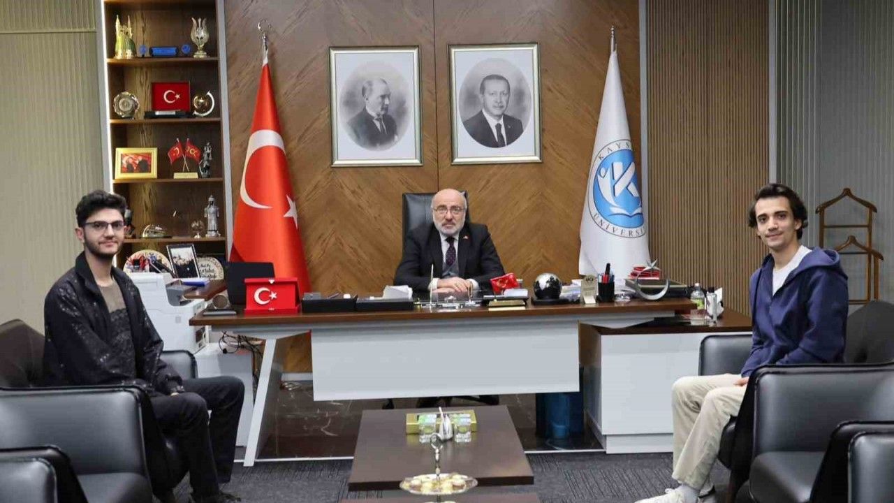 Kayseri Üniversitesi (KAYÜ) Teknik Bilimler Meslek Yüksekokulu Elektronik Teknolojisi Programı öğrencileri Taha Şaş ve Erdem Özrendeci, Rektör Prof. Dr. Kurtuluş Karamustafa’yı ziyaret etti.