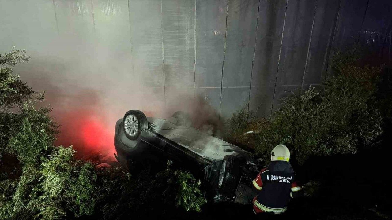Mersin’de seraya çarpıp ters dönen elektrikli araçtaki batarya yangını itfaiye ekiplerince söndürülürken, sürücü hastaneye kaldırıldı.