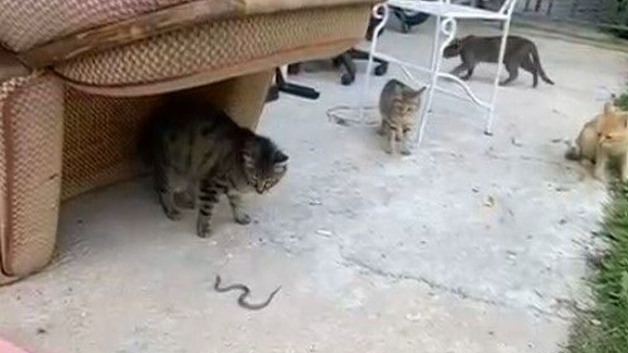 Gümüşhane’de bahçede karşılarına çıkan yavru yılanla oynayan kedilerin görüntüleri cep telefonu kamerasıyla kaydedildi.