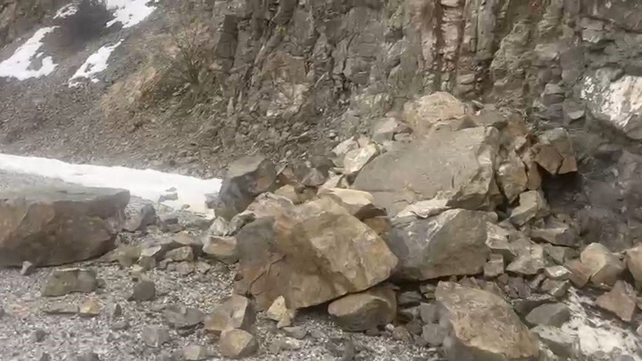 Erzincan'ın Kemah ilçesinde meydana gelen 4,9 büyüklüğündeki depremin ardından depremin merkez üssü olan Hakbilir köyü yoluna dağdan kopan kayalar düştü.