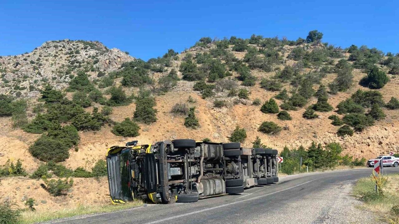 Erzincan’ın Kemaliye ilçesinde virajı alamayan tır devrildi.