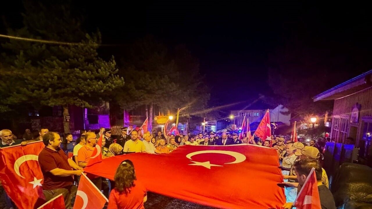 Türk bayrakları eşliğinde marşlarla yürüyen vatandaşlar, meydanda bir araya geldi. Saygı duruşu ve İstiklal Marşı’nın okunmasıyla başlayan program, Kur’an-ı Kerim tilaveti ile devam etti. Ardından ülkenin birlik ve bütünlüğü için dua edildi.