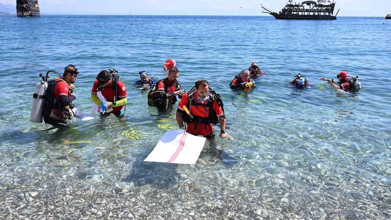 Mavi bayrak sahibi Kemer Belediyesi Halk Plajı’nda yapılan etkinlikte SKUT üyeleri, deniz dibinde temizlik yaptı. Etkinliğe katılan çevre gönüllüleri de sahilde çöp topladı.