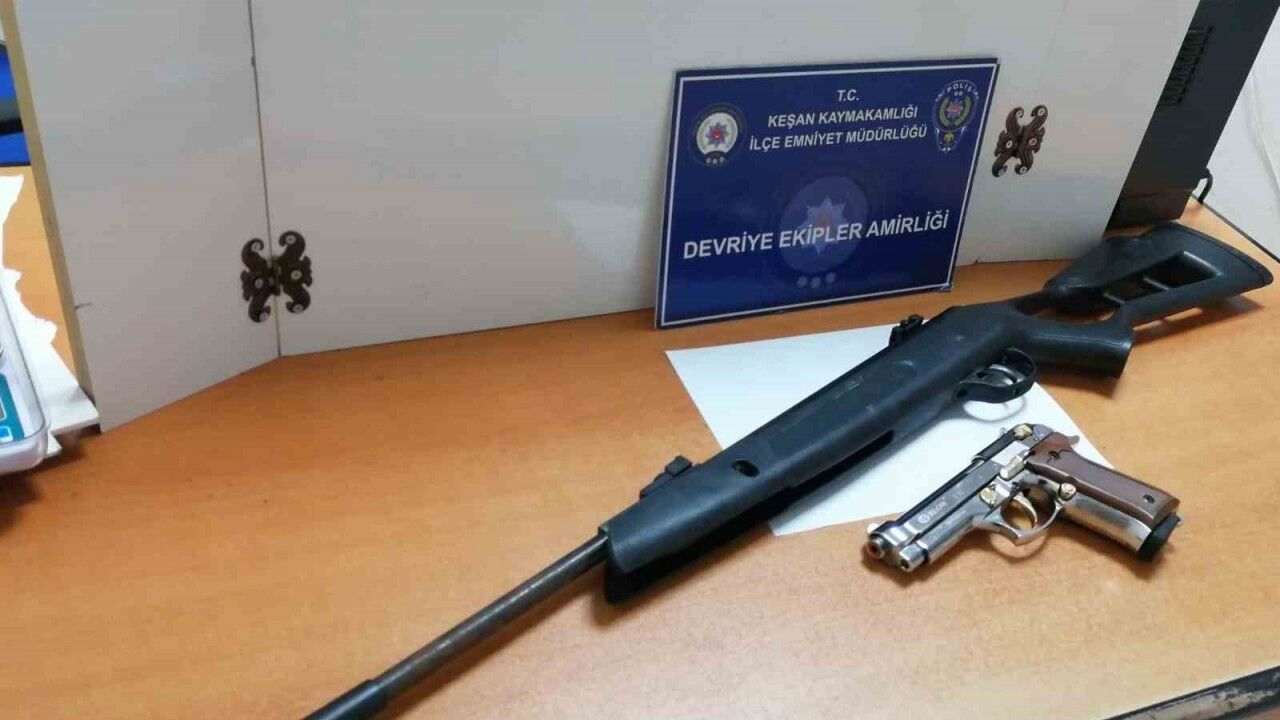 Edirne’nin Keşan ilçesinde, polisin durdurdüğü şüphelinin üzerinde havalı tüfek ve kurusıkı tabanca ele geçirildi.