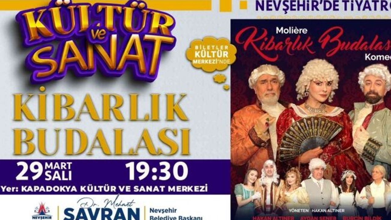 Nevşehir Belediyesi Kültür ve Sosyal İşler Müdürlüğü tarafından düzenlenen Kültür ve Sanat Günleri etkinlikleri kapsamında Moliere’in ölümsüz eseri ’Kibarlık Budalası’ sanatseverler ile buluşuyor. Hakan Altıner, Aydan Şener ve Burçin Bildik gibi usta isimlerin rol aldıkları komedi oyunu, 29 Mart 2022 Salı günü saat 19.30’da Nevşehir Belediyesi Kültür ve Sanat Merkezi’nde sahnelenecek. Tiyatro severler oyun için biletlerini 5 TL karşılığında Nevşehir Belediyesi Kapadokya Kültür ve Sanat Merkezi’nden alabilecek.